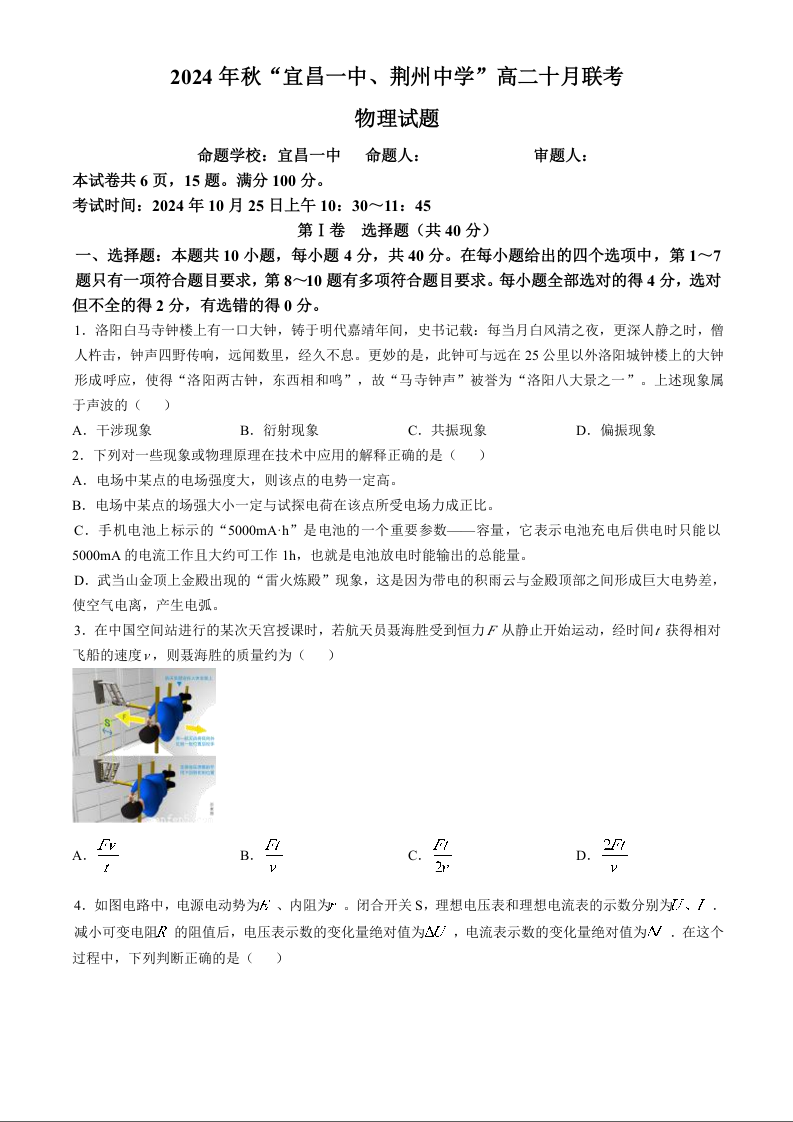 湖北省宜昌市2024年秋“宜昌一中、荆州中学”高二十月联考物理+答案