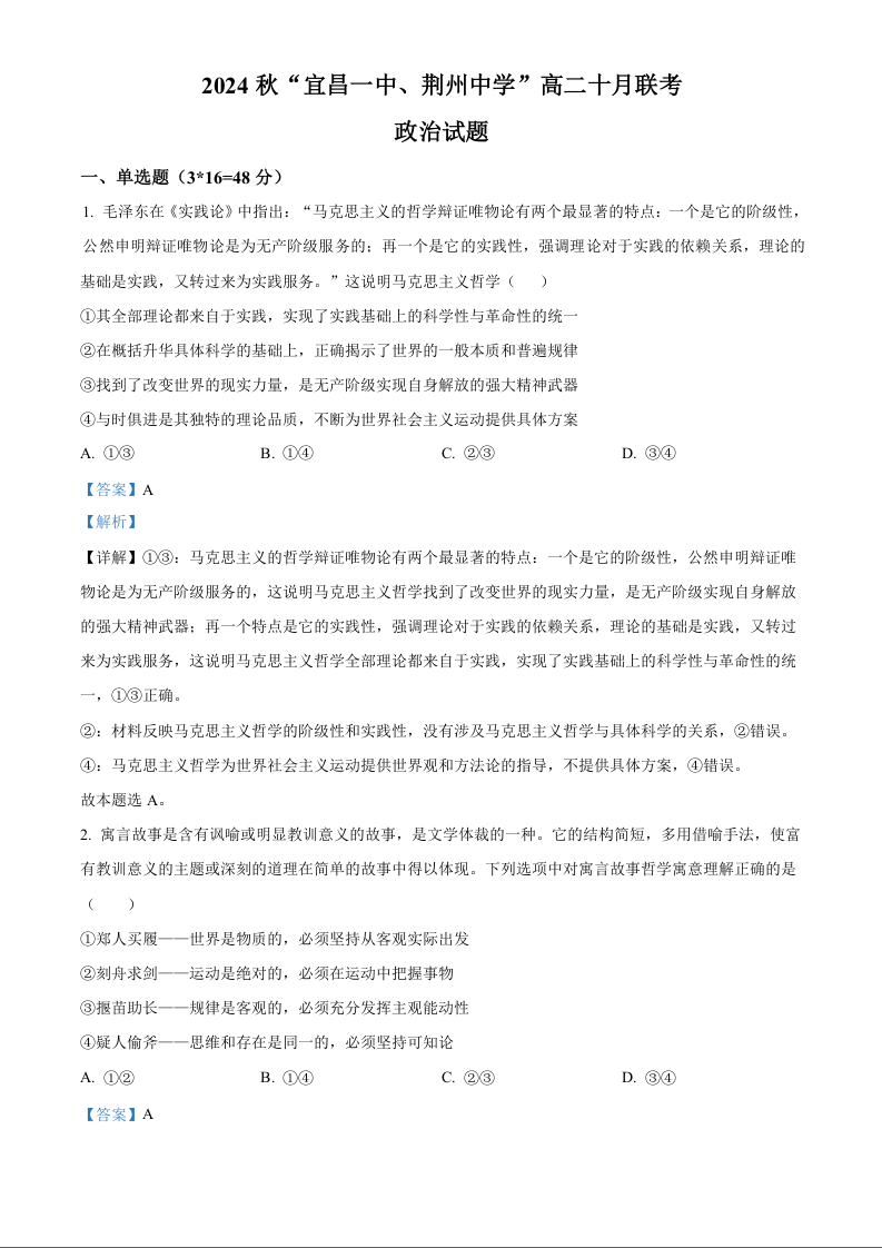 湖北省宜昌市2024年秋“宜昌一中、荆州中学”高二十月联考政治答案