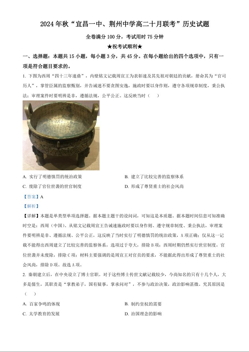 湖北省宜昌市2024年秋“宜昌一中、荆州中学”高二十月联考历史答案
