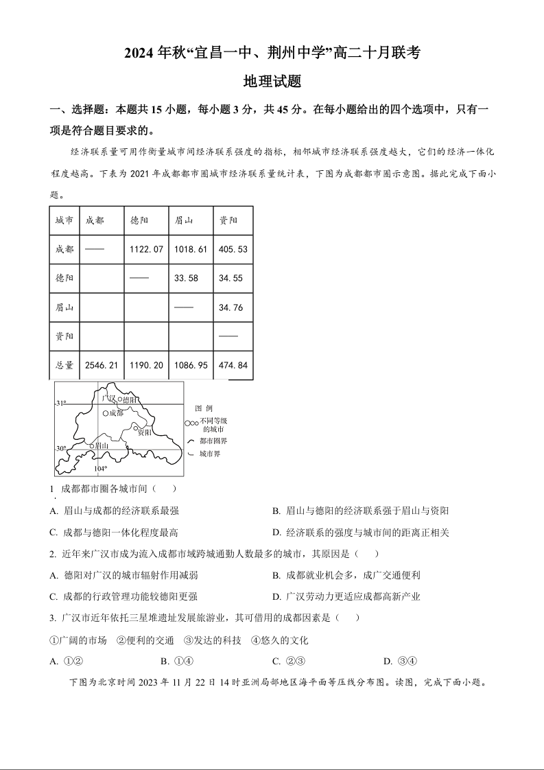 湖北省宜昌市2024年秋“宜昌一中、荆州中学”高二十月联考地理