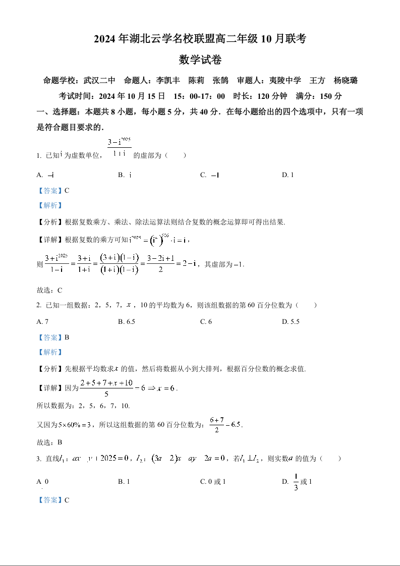 湖北省云学部分重点高中2024年联盟高三年级10月联考数学答案