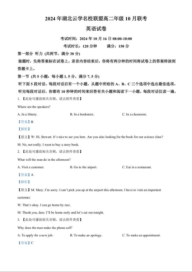 湖北省云学部分重点高中2024年联盟高三年级10月联考英语答案