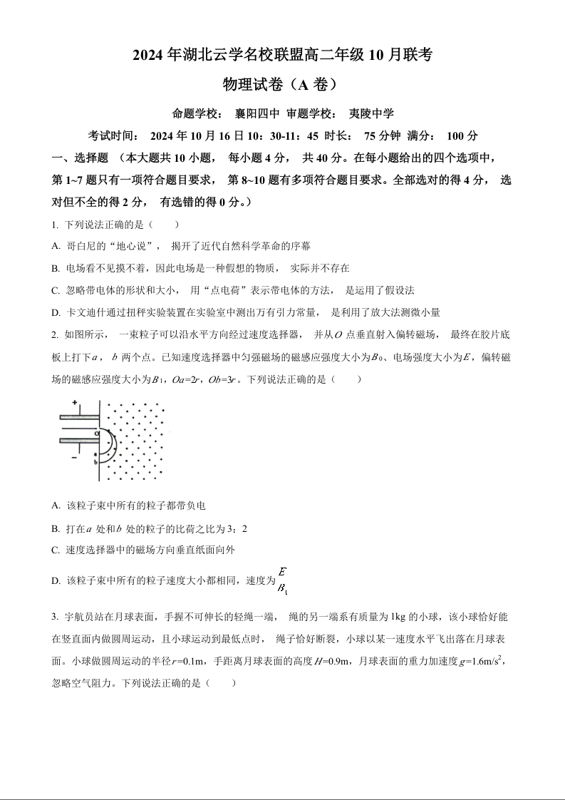 湖北省云学部分重点高中2024年联盟高三年级10月联考物理