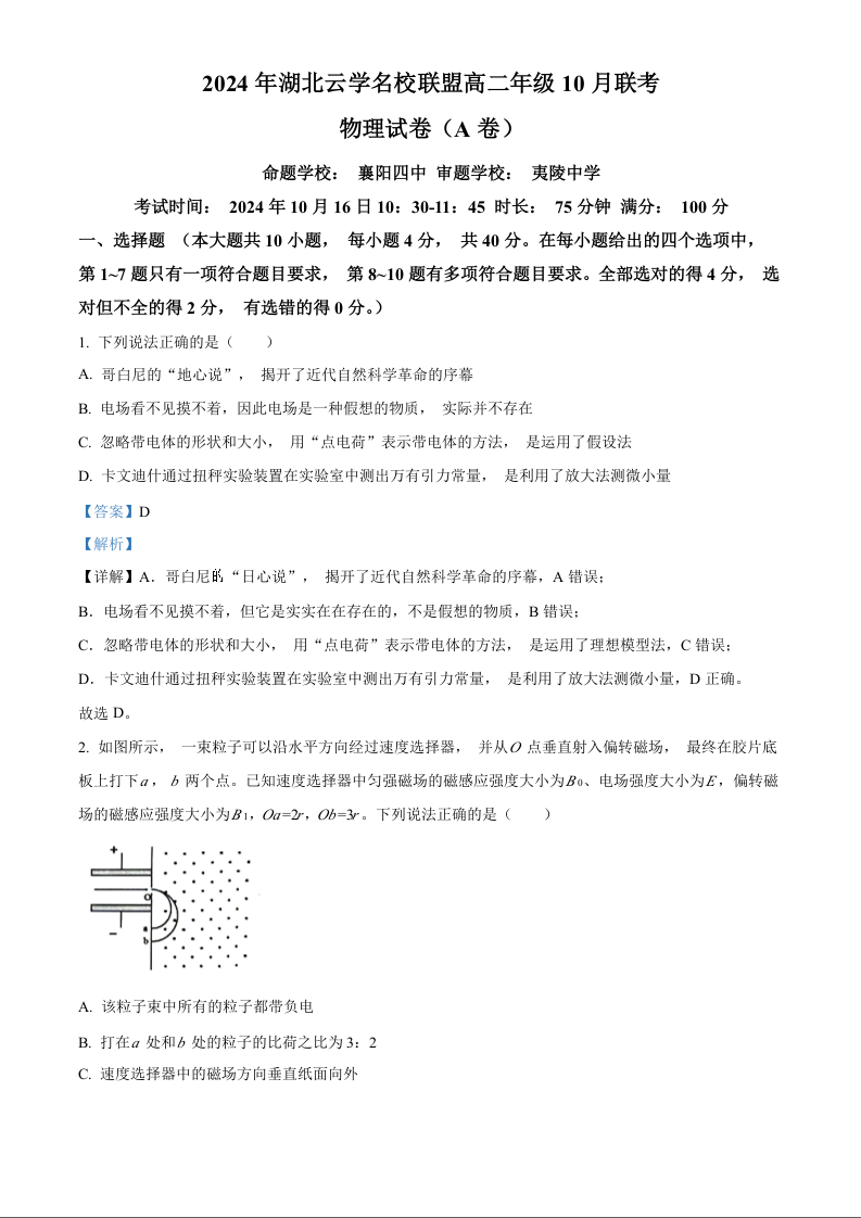 湖北省云学部分重点高中2024年联盟高三年级10月联考物理答案