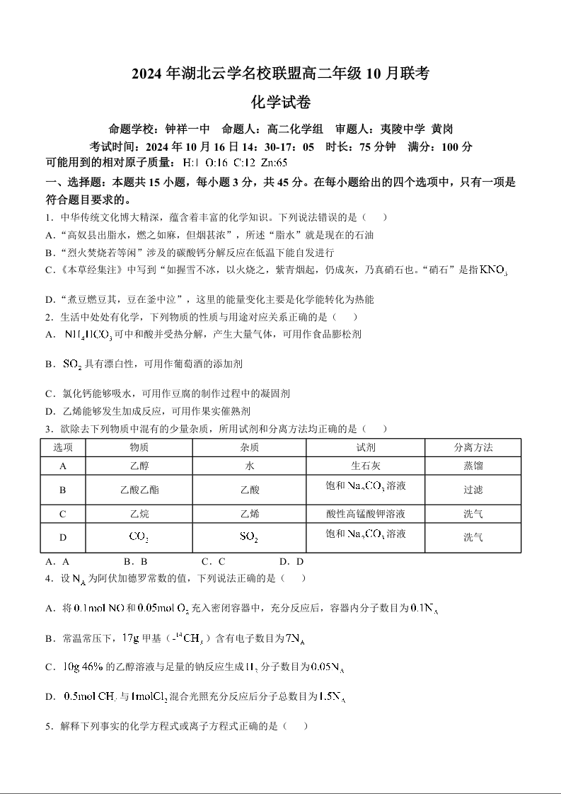 湖北省云学部分重点高中2024年联盟高三年级10月联考化学+答案