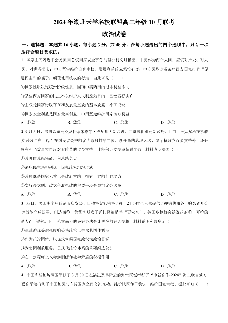 湖北省云学部分重点高中2024年联盟高三年级10月联考政治