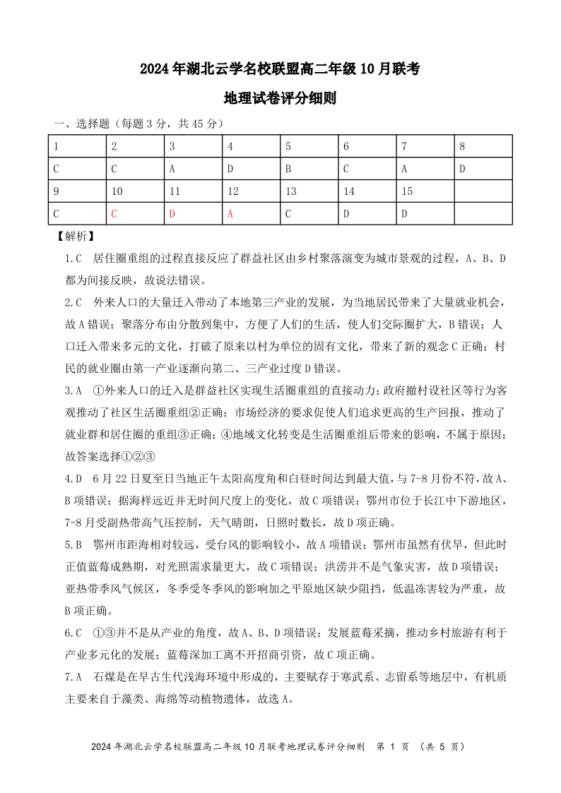 湖北省云学部分重点高中2024年联盟高三年级10月联考地理答案(B)