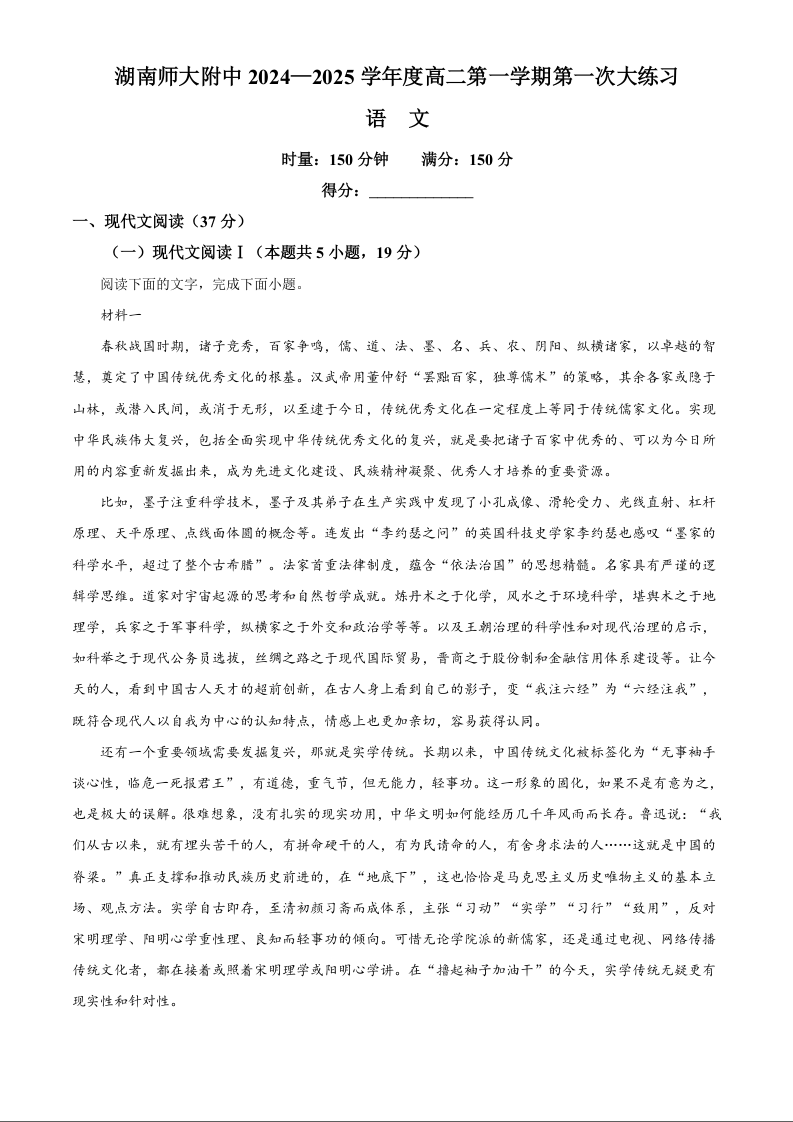 湖南省长沙市师大附中2024—2025学年度高二第一学期第一次大练习语文