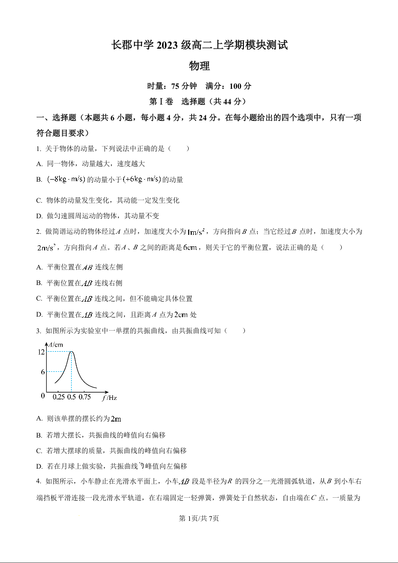 湖南省长沙市长郡中学2023级高二上学期模块测试物理(原卷版)
