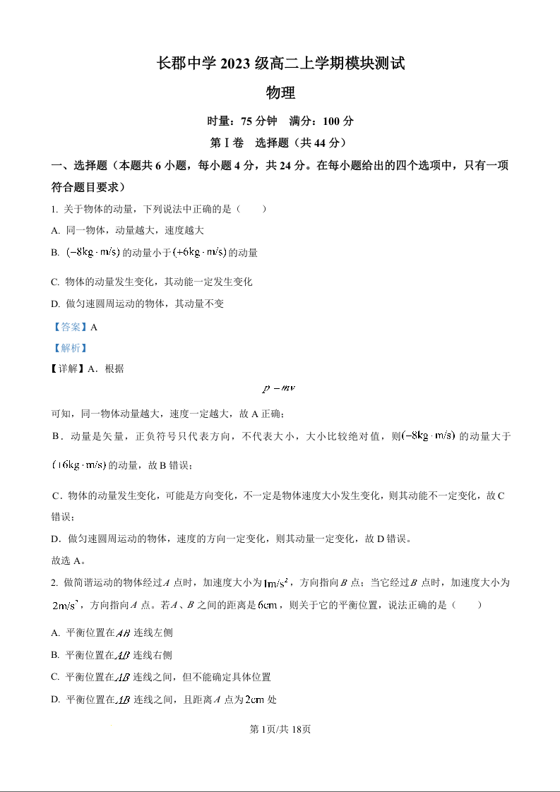 湖南省长沙市长郡中学2023级高二上学期模块测试物理(解析版)