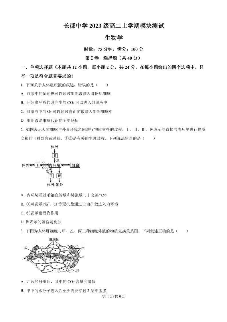 湖南省长沙市长郡中学2023级高二上学期模块测试生物(原卷版)