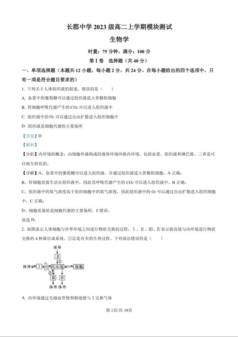 湖南省长沙市长郡中学2023级高二上学期模块测试生物(解析版)