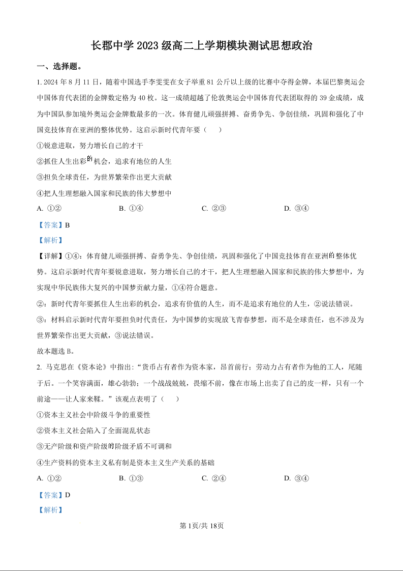 湖南省长沙市长郡中学2023级高二上学期模块测试政治(解析版)