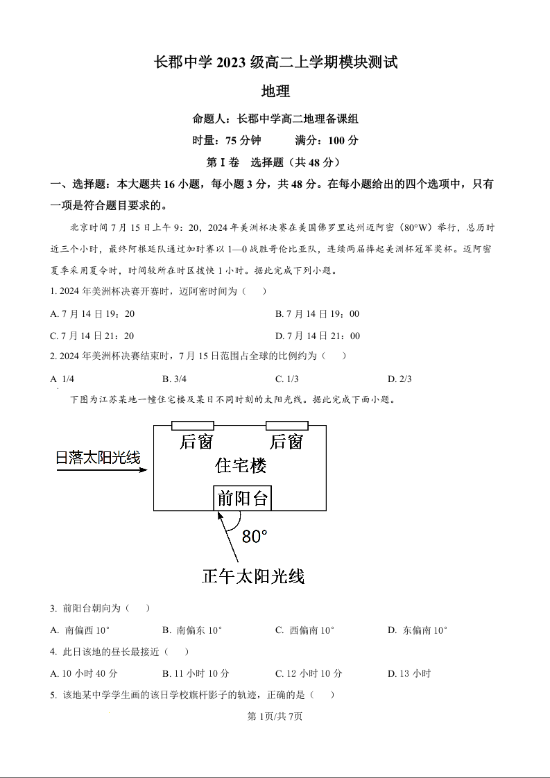 湖南省长沙市长郡中学2023级高二上学期模块测试地理(原卷版)