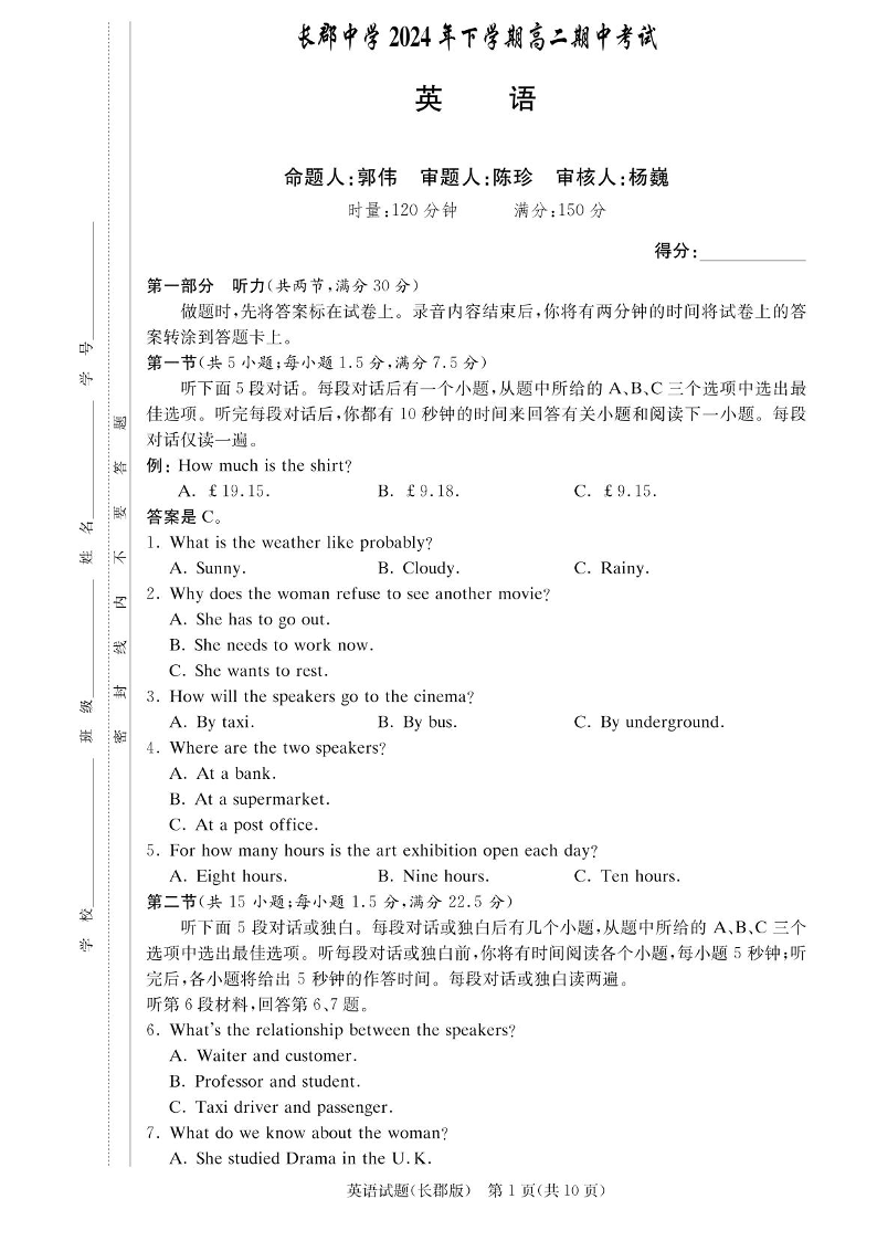 湖南省长沙市长郡中学2024年下学期高二期中考试英语+答案