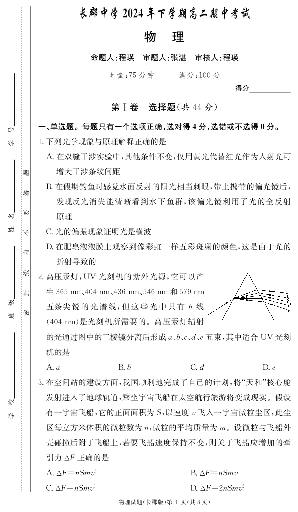 湖南省长沙市长郡中学2024年下学期高二期中考试物理