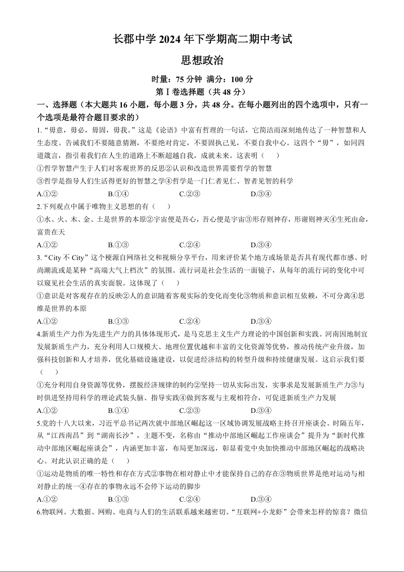 湖南省长沙市长郡中学2024年下学期高二期中考试政治+答案