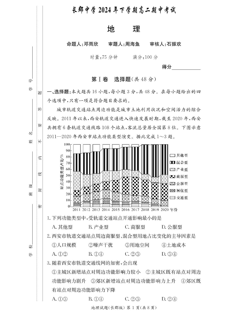 湖南省长沙市长郡中学2024年下学期高二期中考试地理+答案