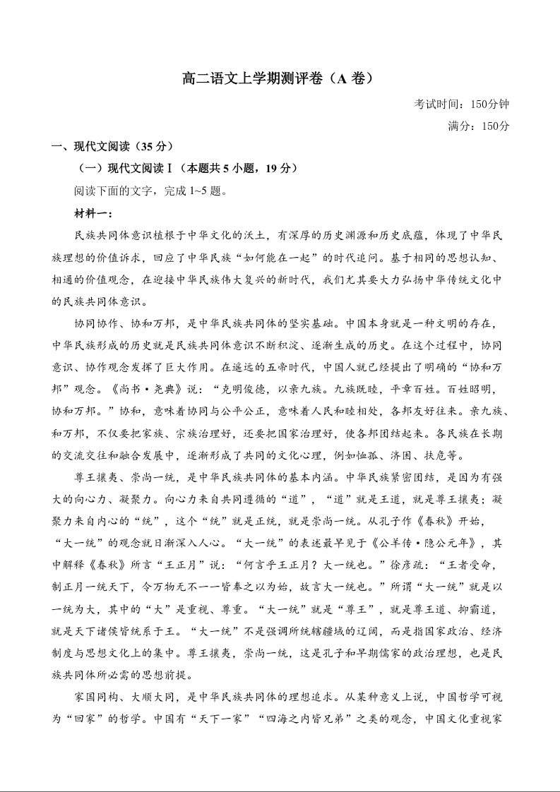 湖南省衡阳市衡阳县部分学校2024-2025学年高二上学期测评语文+答案(A卷)