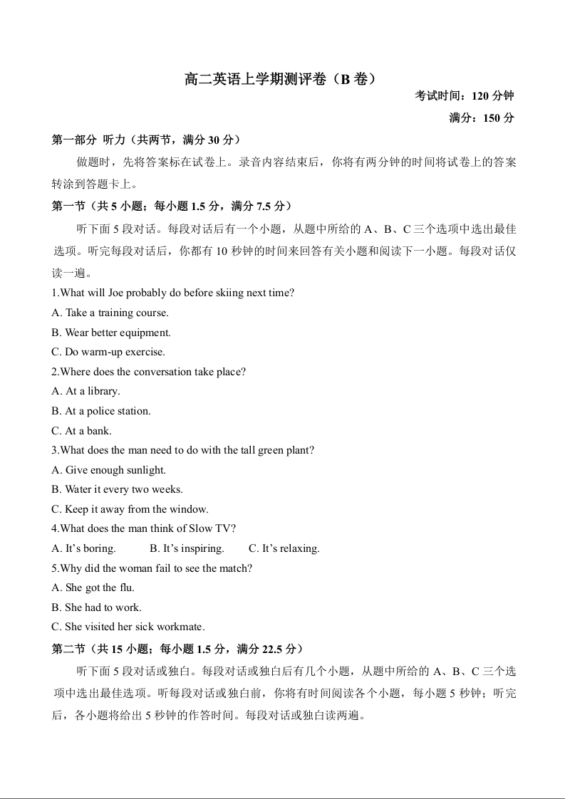湖南省衡阳市衡阳县部分学校2024-2025学年高二上学期测评英语+答案(B卷)