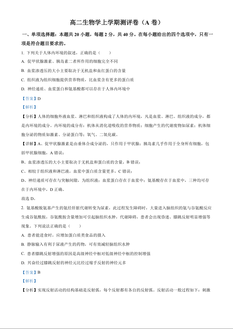 湖南省衡阳市衡阳县部分学校2024-2025学年高二上学期测评生物答案(A卷)