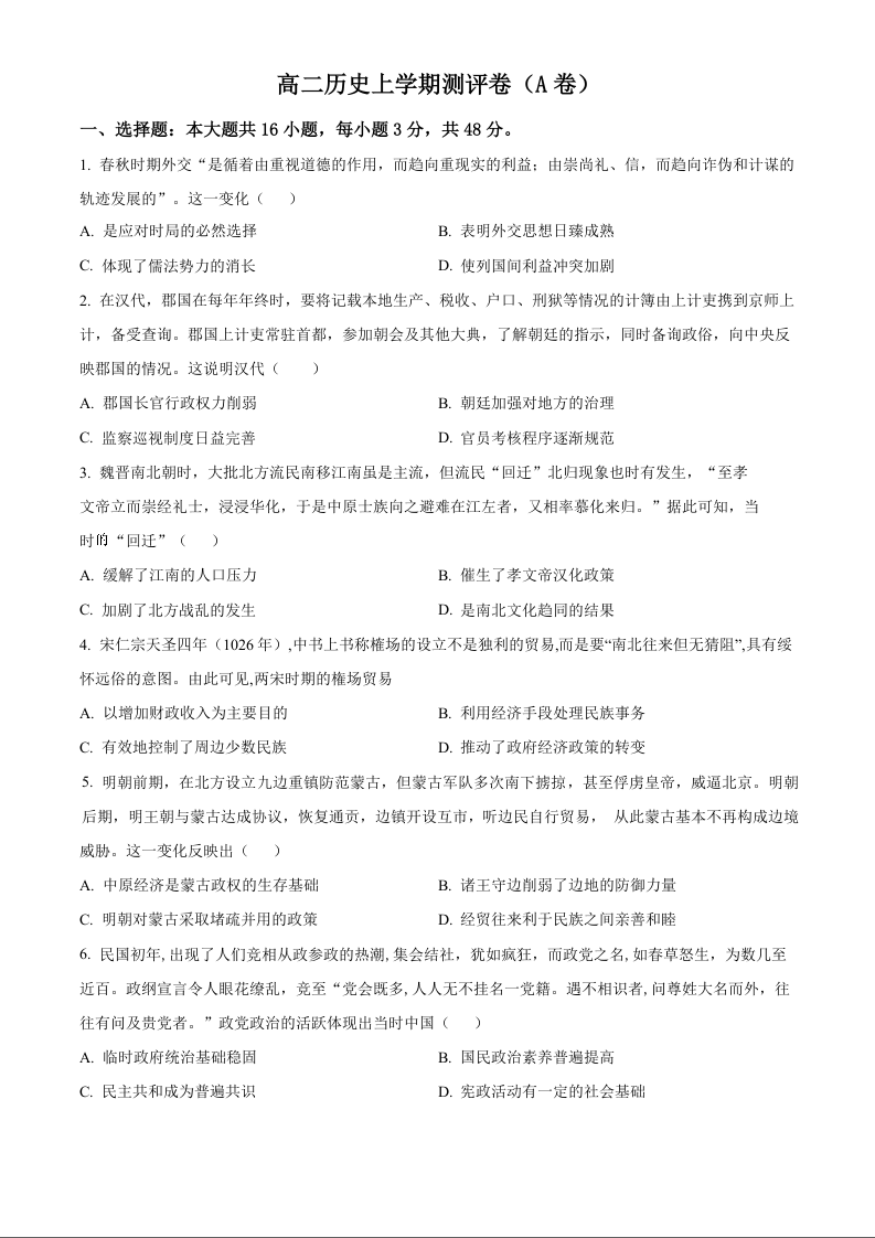 湖南省衡阳市衡阳县部分学校2024-2025学年高二上学期测评(A卷)历史