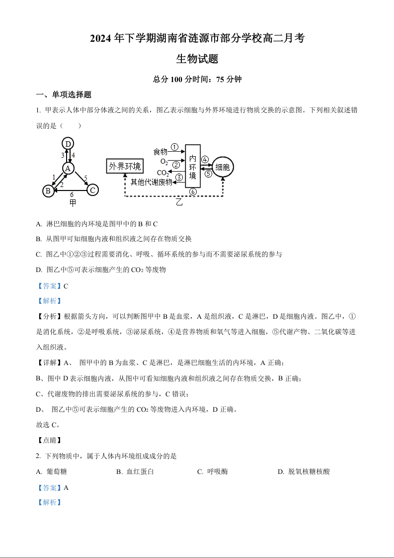 湖南省娄底市涟源市2024年下学期部分学校高二月考生物答案
