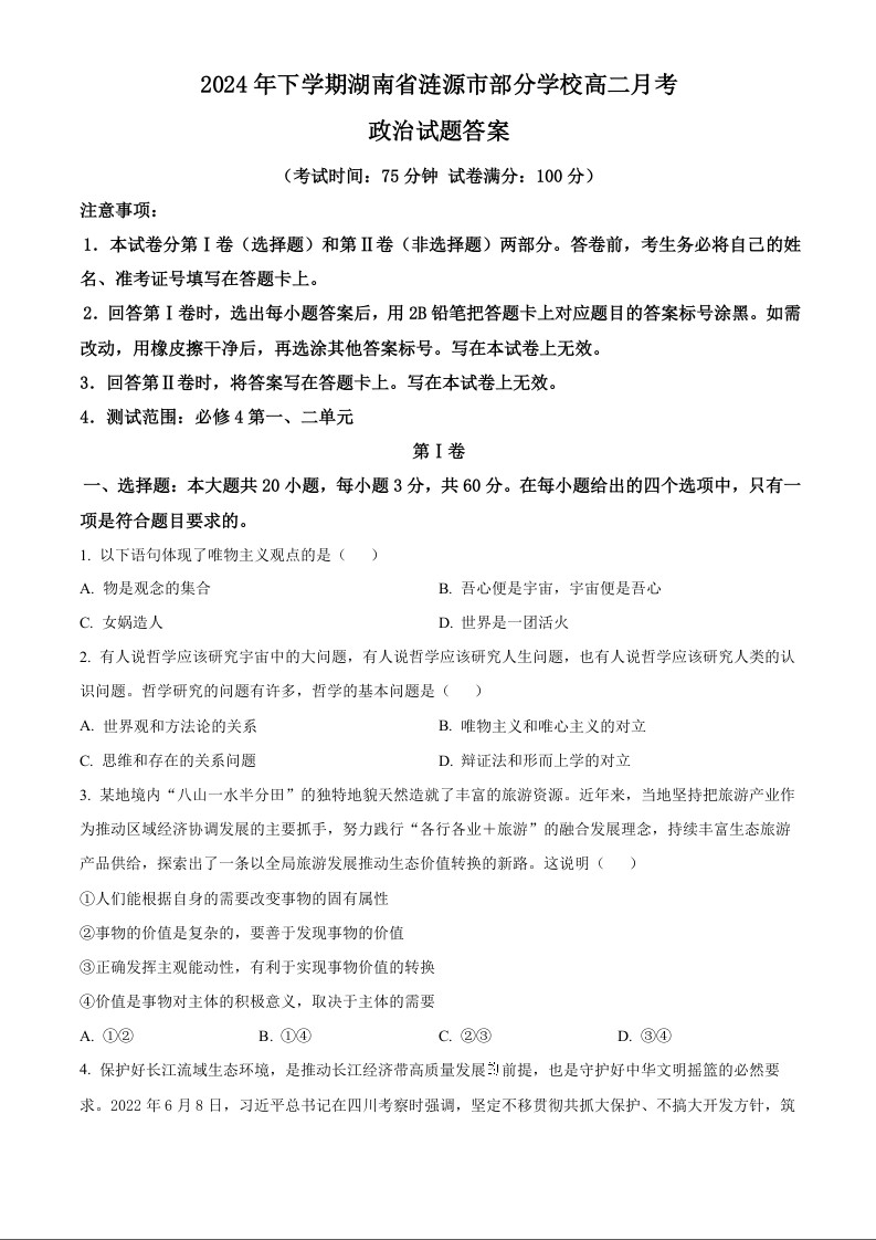 湖南省娄底市涟源市2024年下学期部分学校高二月考政治