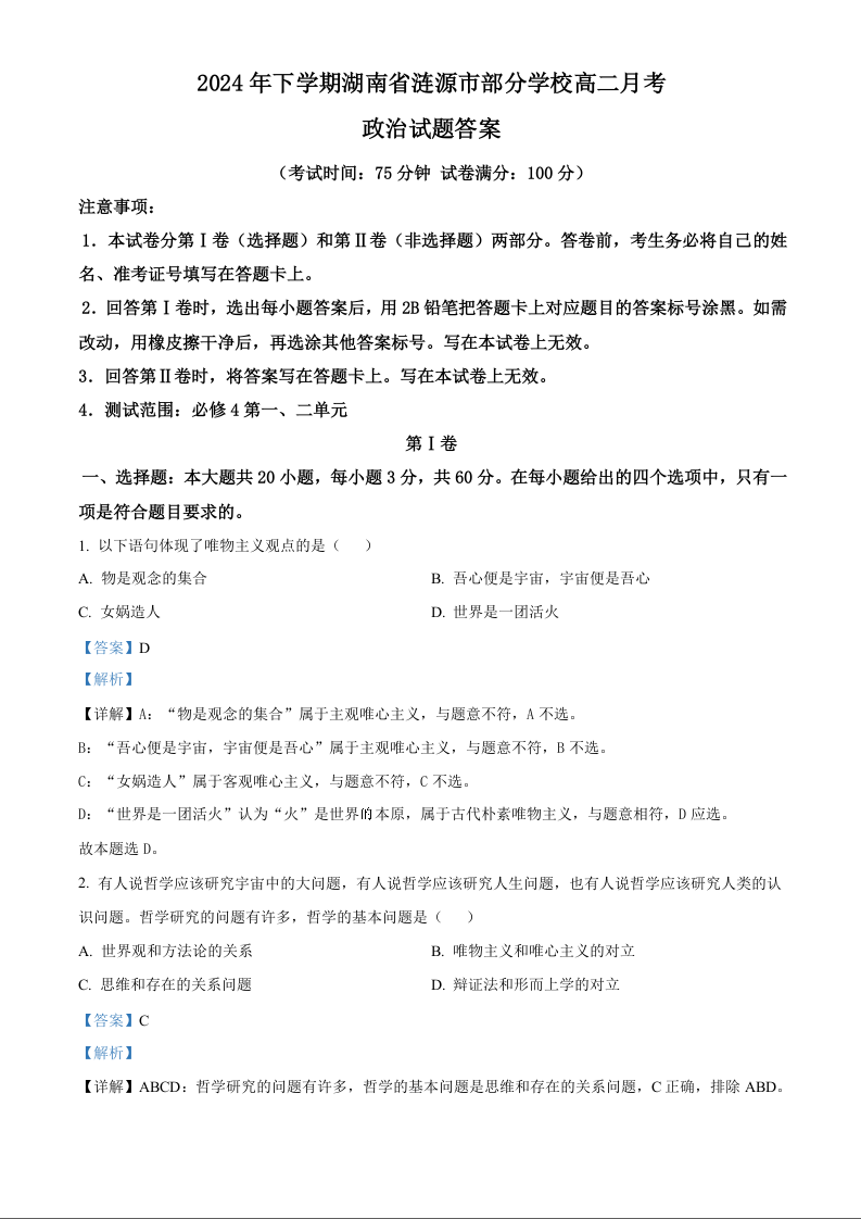湖南省娄底市涟源市2024年下学期部分学校高二月考政治答案