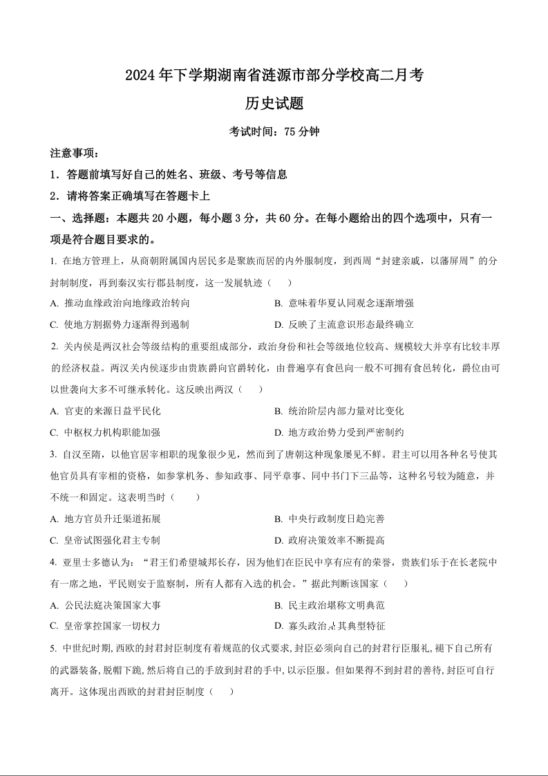 湖南省娄底市涟源市2024年下学期部分学校高二月考历史