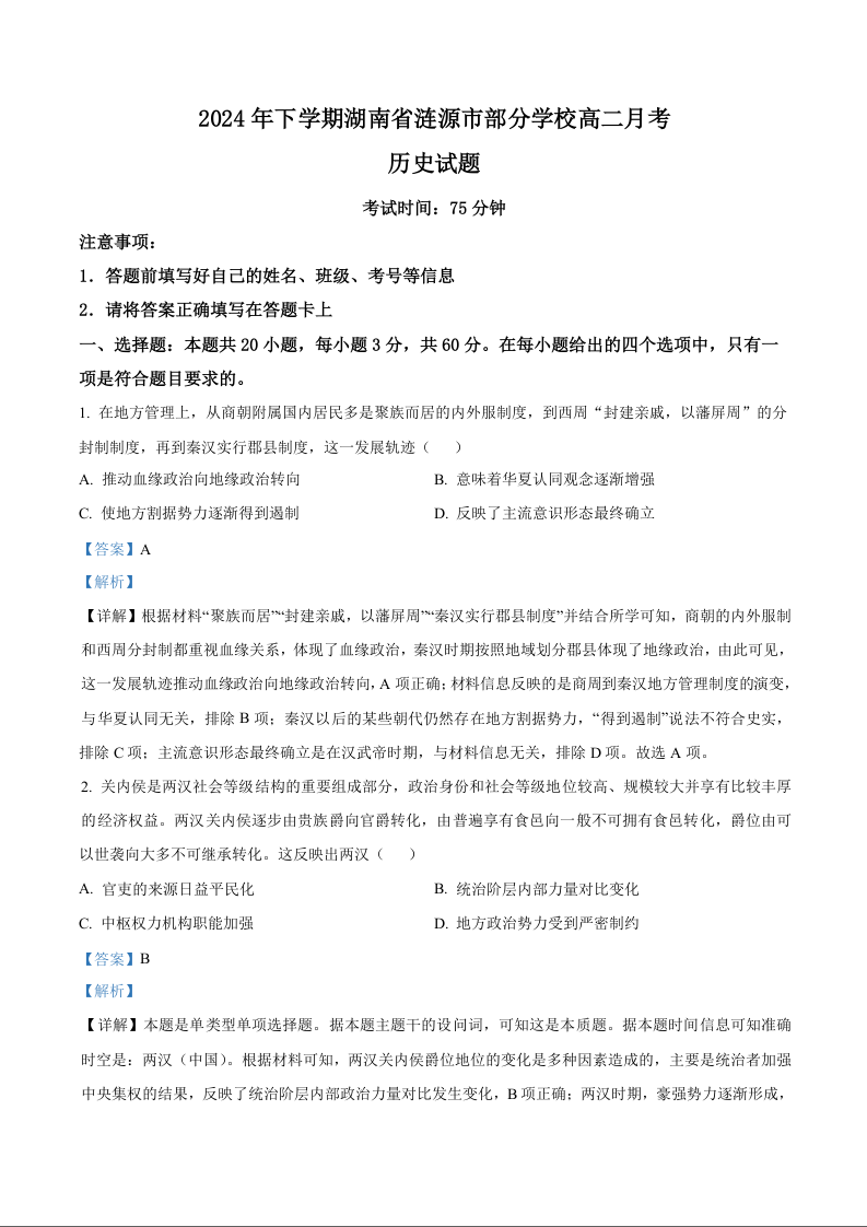 湖南省娄底市涟源市2024年下学期部分学校高二月考历史答案