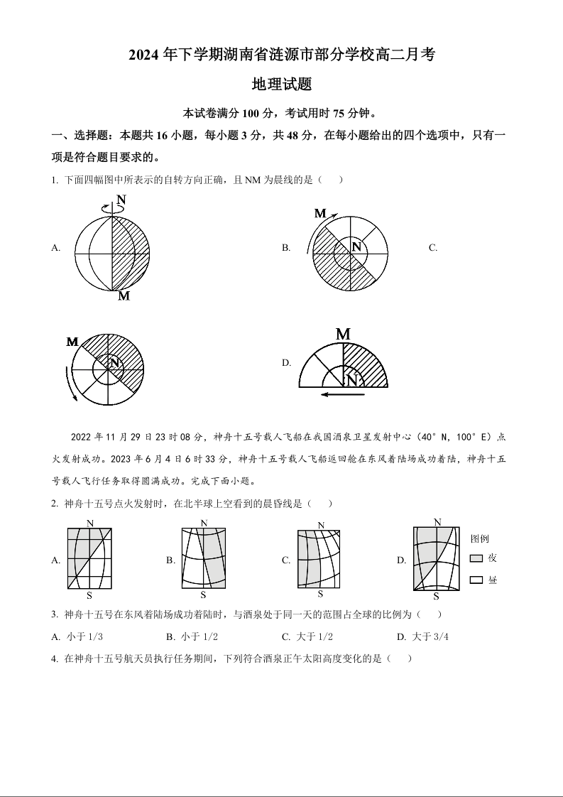 湖南省娄底市涟源市2024年下学期部分学校高二月考地理