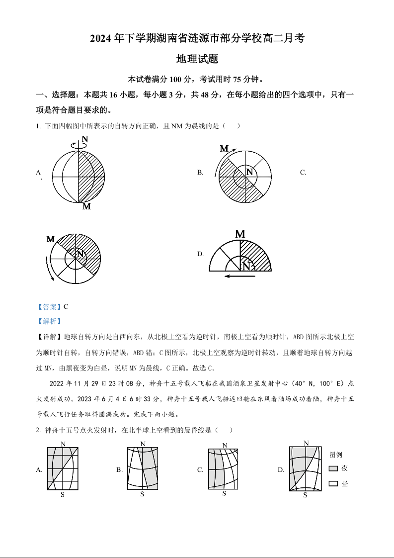 湖南省娄底市涟源市2024年下学期部分学校高二月考地理答案