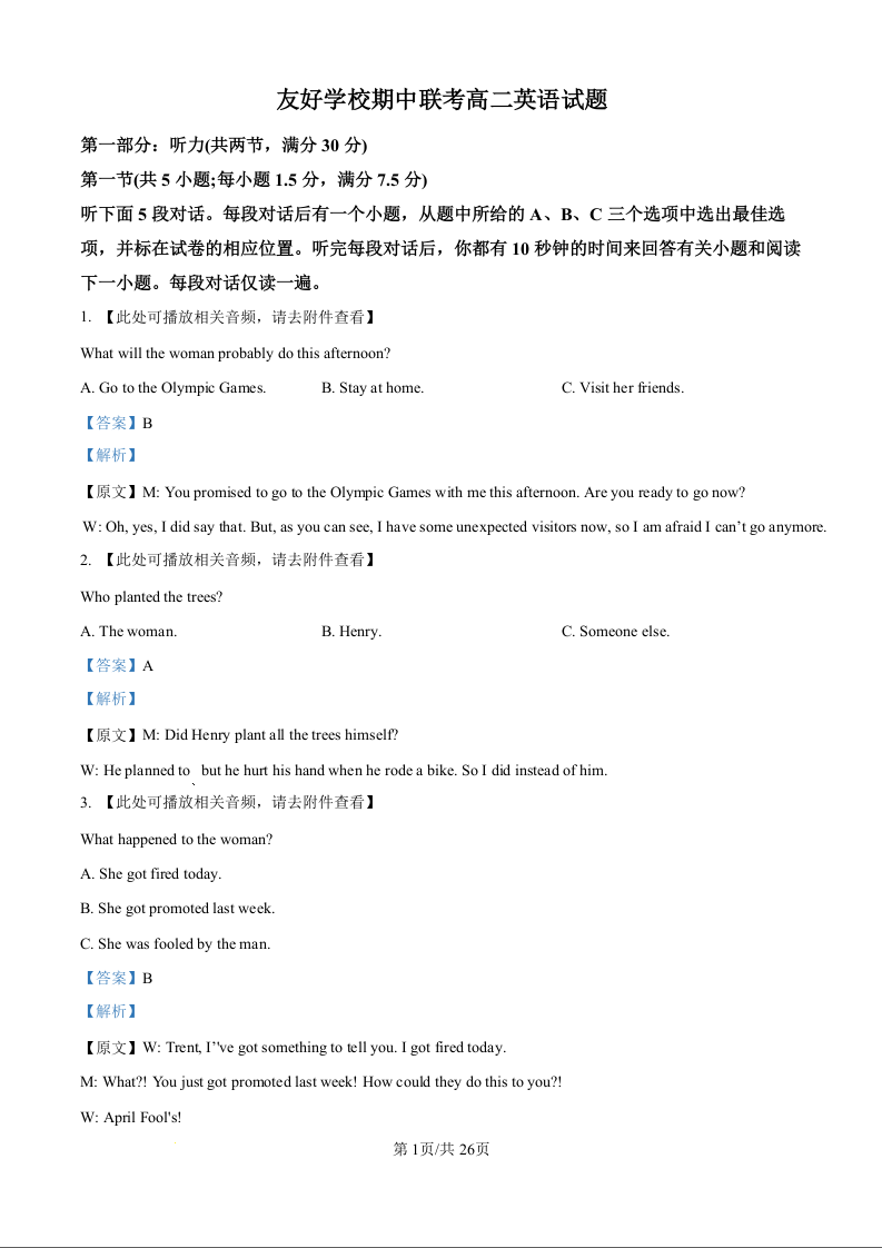 吉林省2024-2025学年度友好学校高二年级期中考卷英语(解析版)