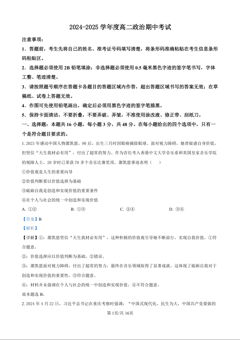 吉林省2024-2025学年度友好学校高二年级期中考卷政治(解析版)