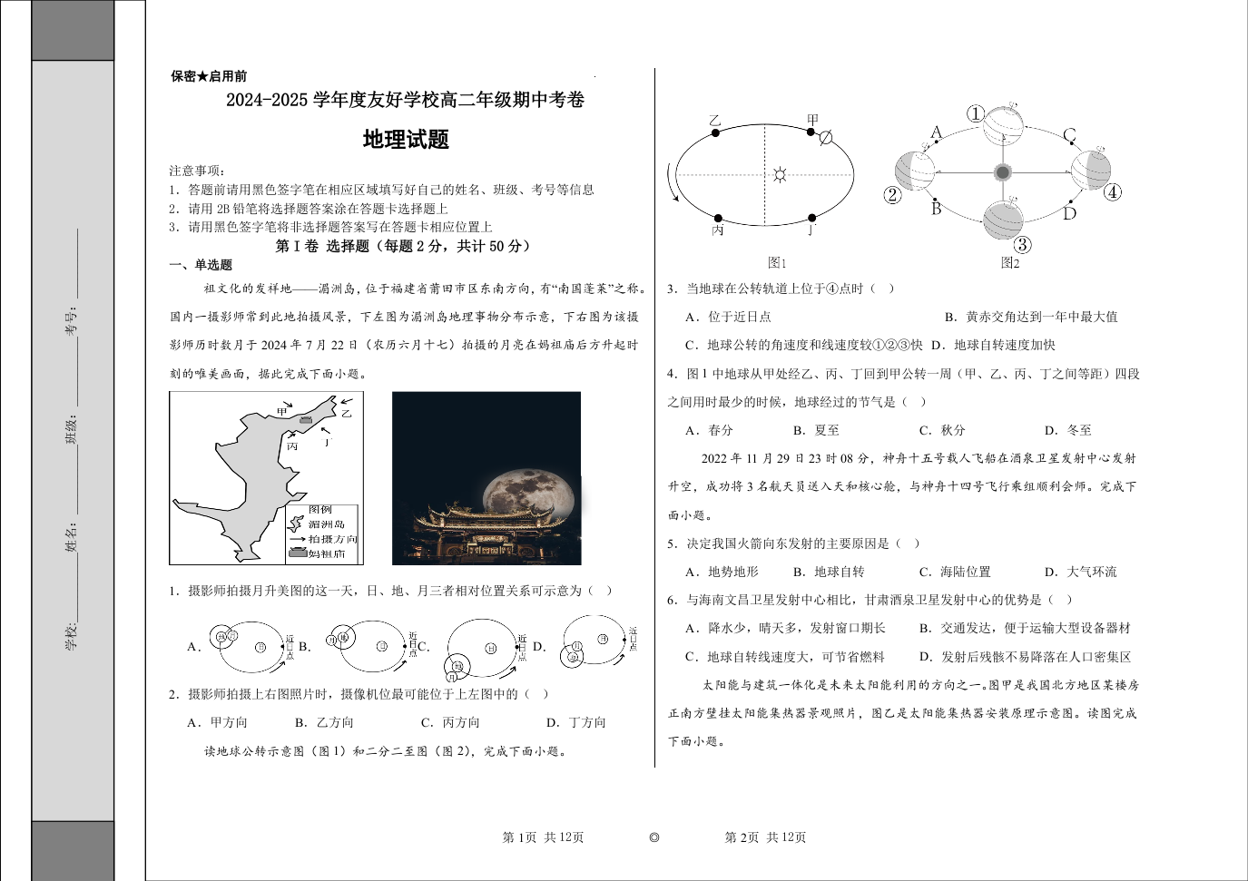 吉林省2024-2025学年度友好学校高二年级期中考卷地理+答案