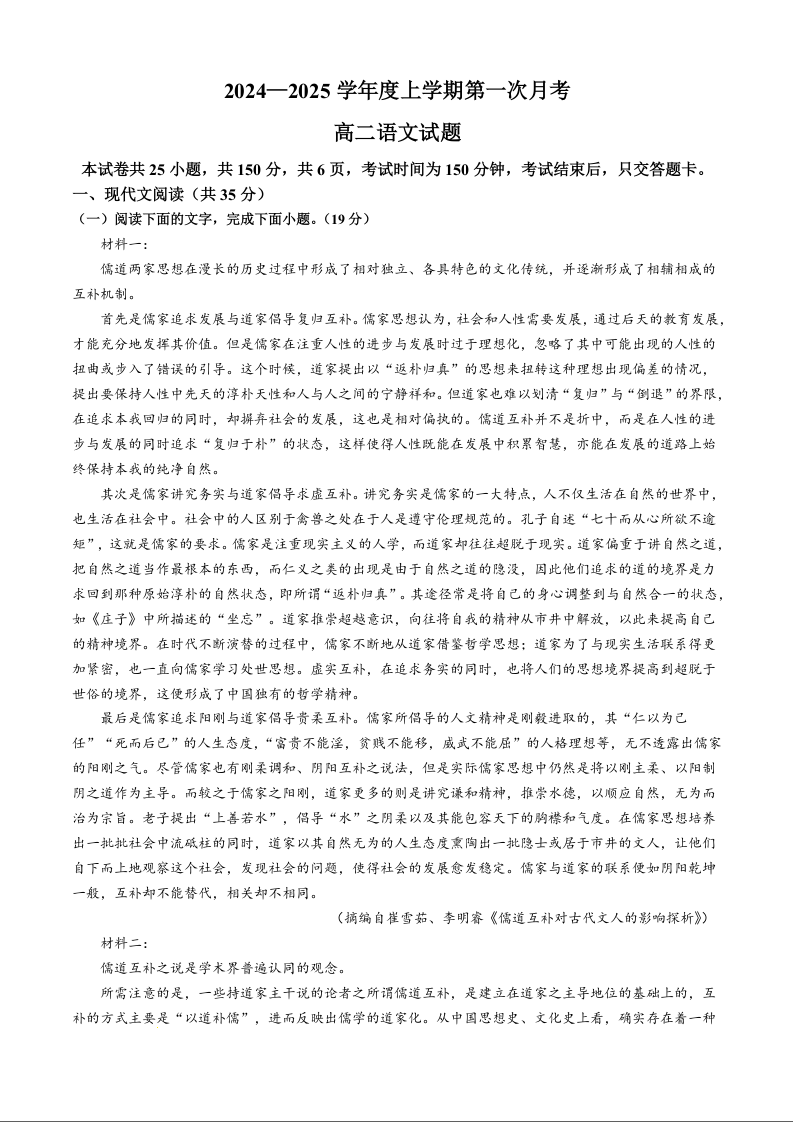 吉林省部分学校2024-2025学年度上学期第一次月考语文+答案