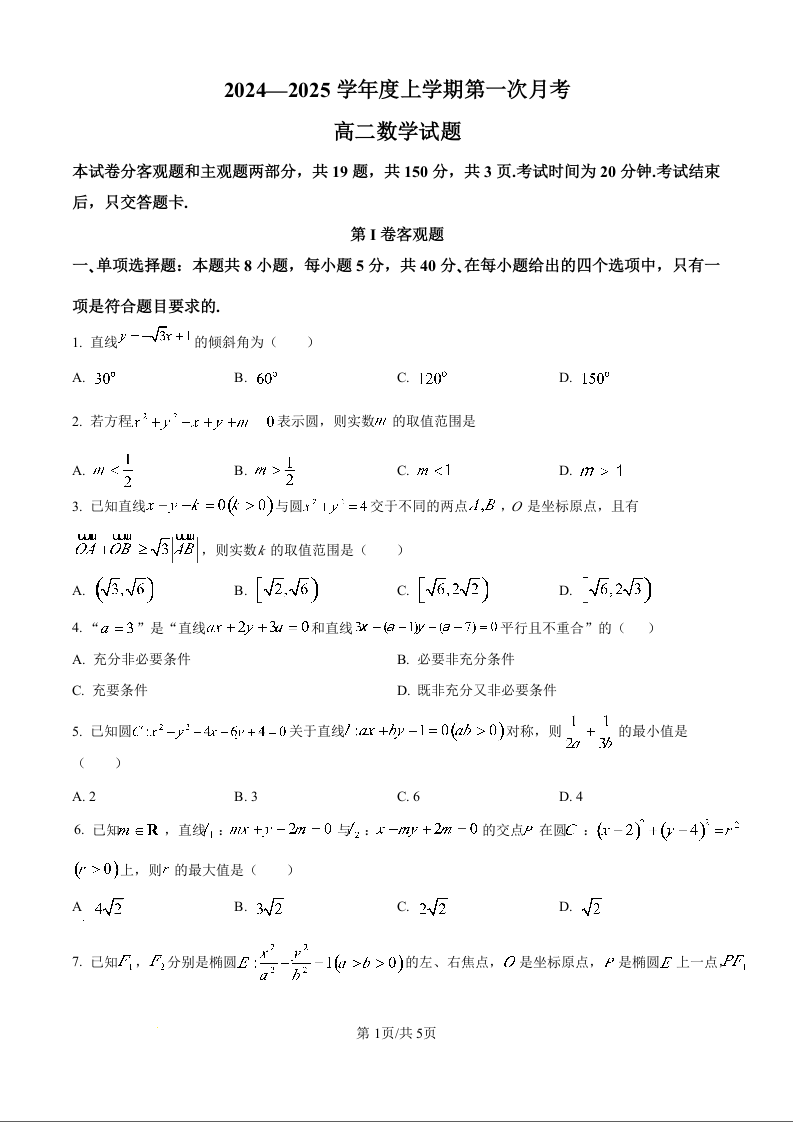 吉林省部分学校2024-2025学年度上学期第一次月考数学(原卷版)
