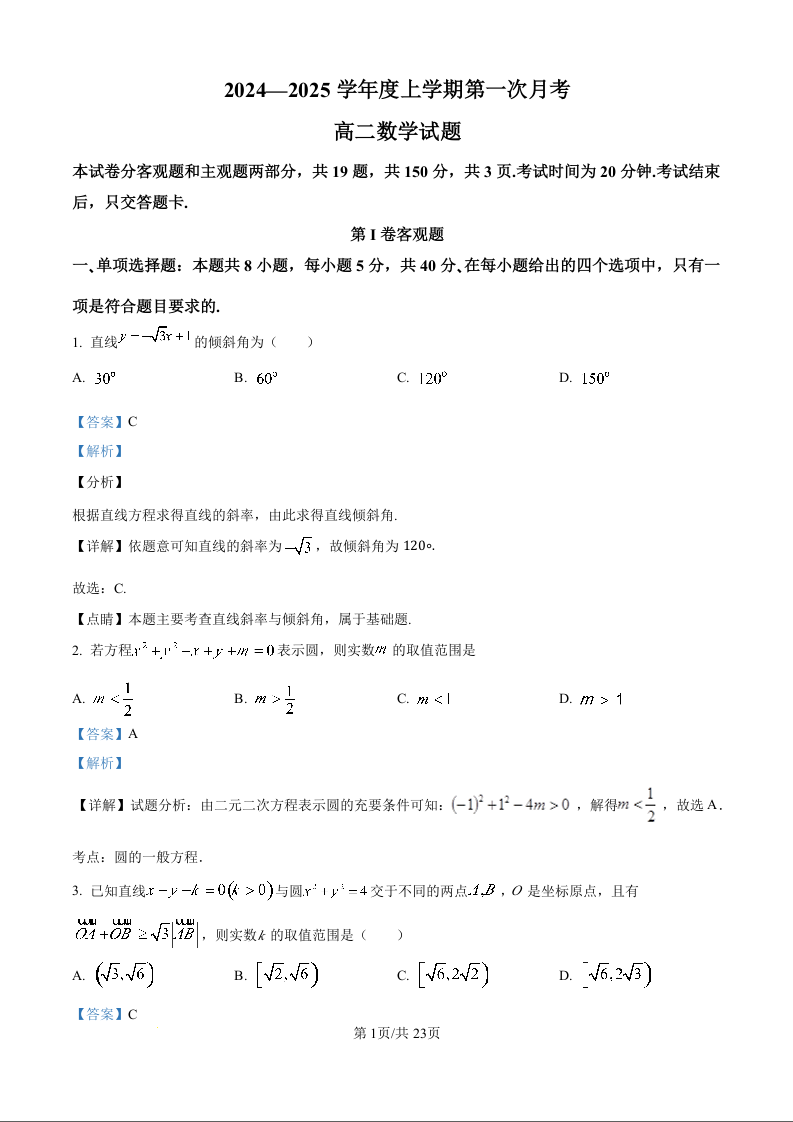 吉林省部分学校2024-2025学年度上学期第一次月考数学(解析版)