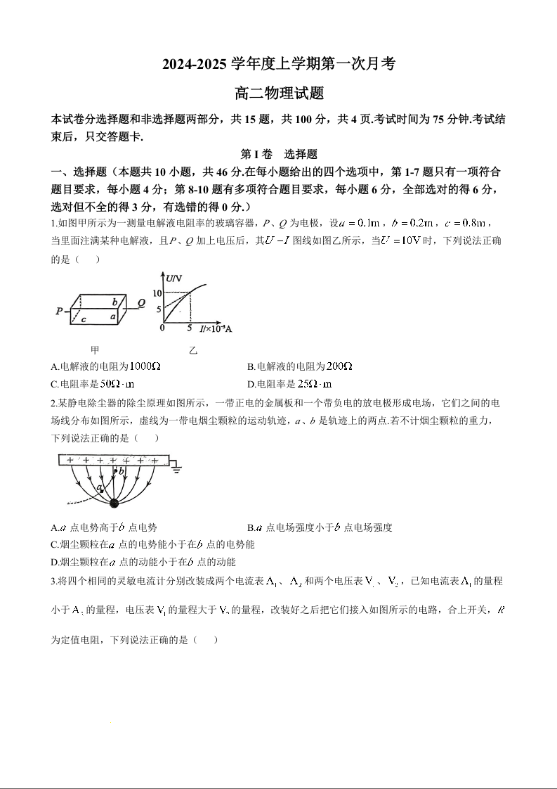 吉林省部分学校2024-2025学年度上学期第一次月考物理+答案