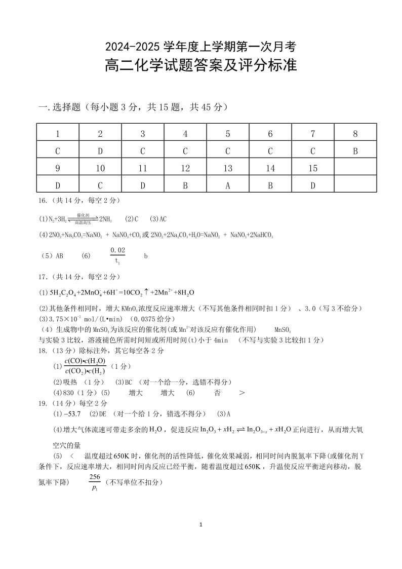 吉林省部分学校2024-2025学年度上学期第一次月考化学答案