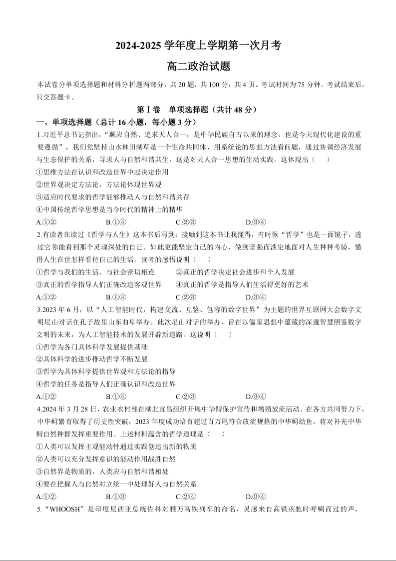 吉林省部分学校2024-2025学年度上学期第一次月考政治+答案