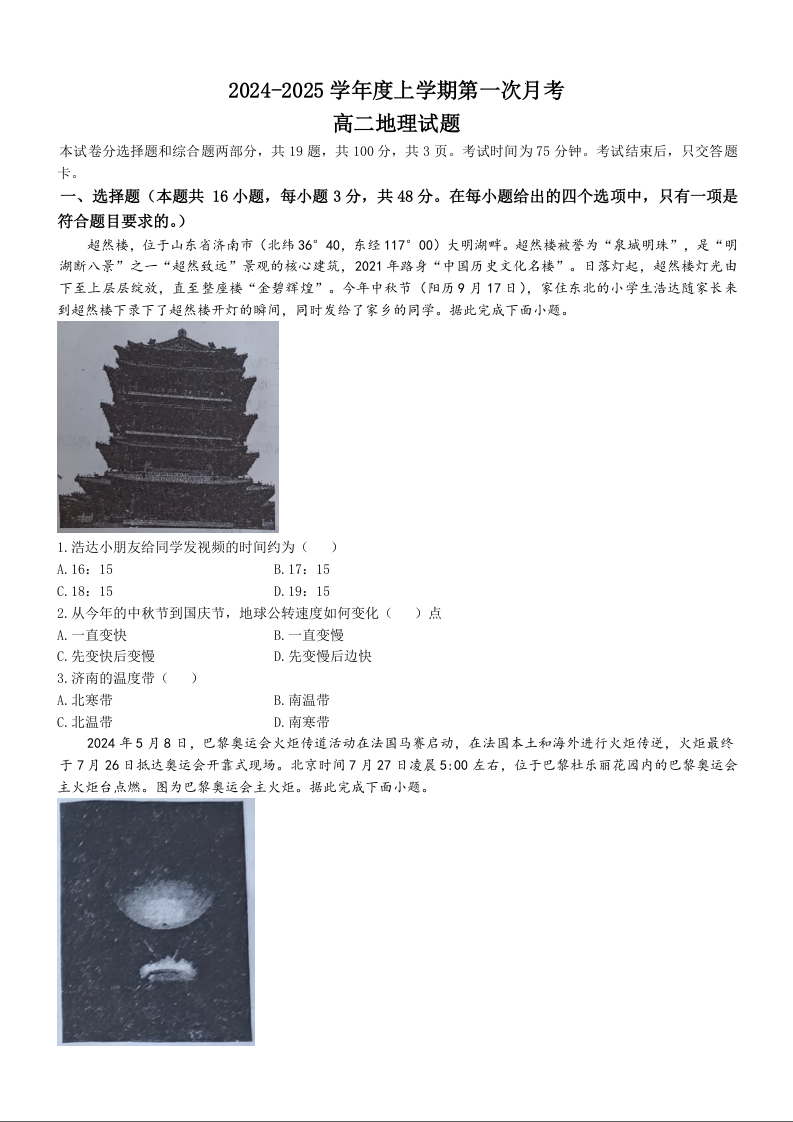 吉林省部分学校2024-2025学年度上学期第一次月考地理+答案