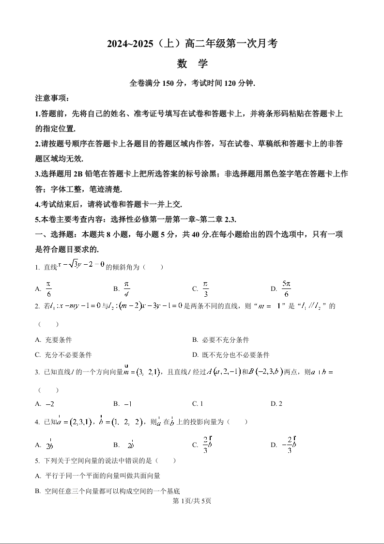 吉林省四校联考2024~2025(上)高二年级第一次月考数学(原卷版)