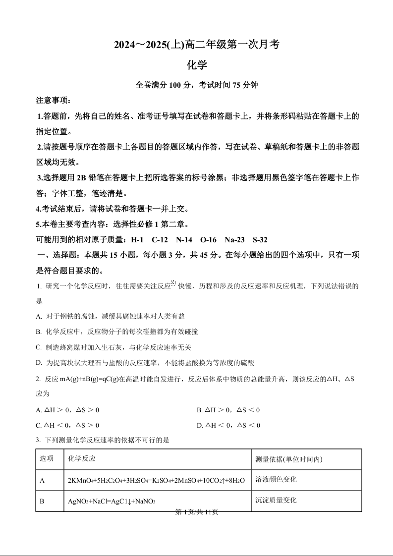 吉林省四校联考2024~2025(上)高二年级第一次月考化学(原卷版)