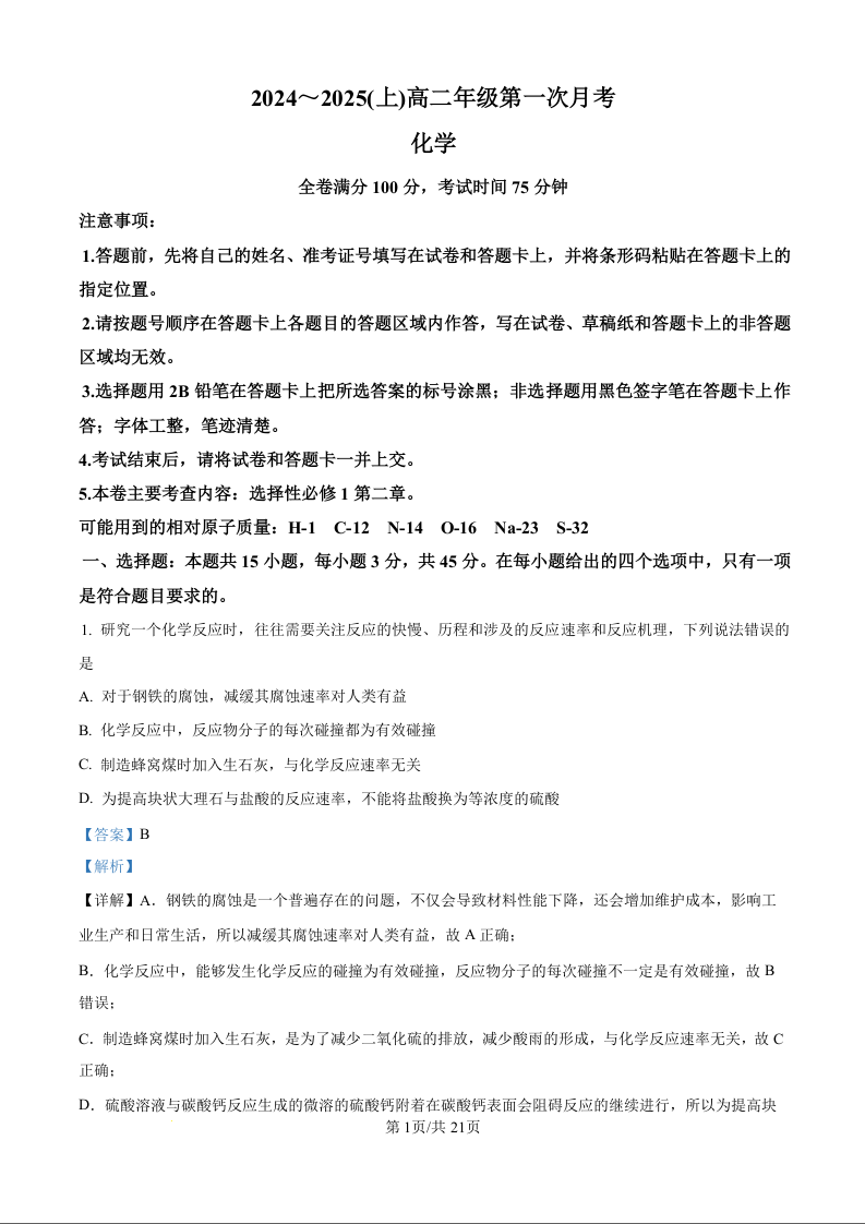 吉林省四校联考2024~2025(上)高二年级第一次月考化学(解析版)