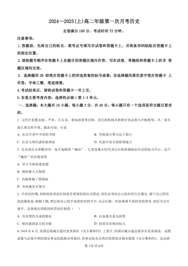 吉林省四校联考2024~2025(上)高二年级第一次月考历史(原卷版)