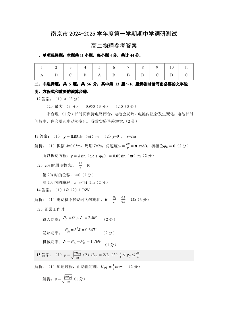 江苏省南京市2024-2025 学年度第一学期期中学调研测试物理答案