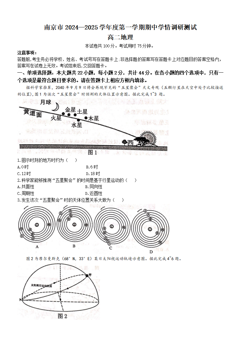 江苏省南京市2024-2025 学年度第一学期期中学调研测试地理