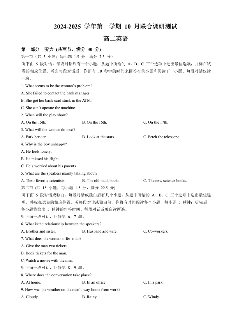 江苏省南京市2024-2025学年第一学期六校联合体10月学情调研测试英语+答案